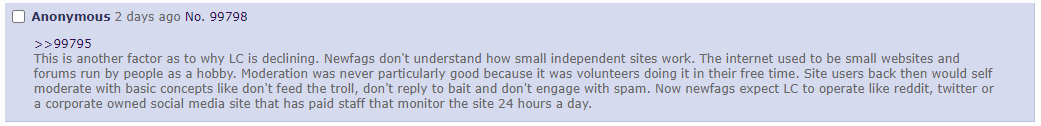>>313330The original post was lamenting that newfags can't self moderate and they expect the same level of moderation on LC as on social media sites.