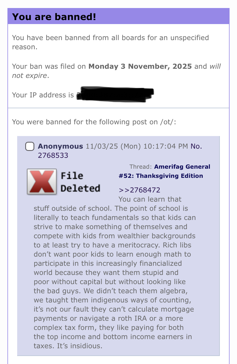 Got in a dumb infight, then got banned for "ban evasion", even though I never saw a ban message when I tried to post in the first place. My posts also weren't redtexted prior AFAICT.