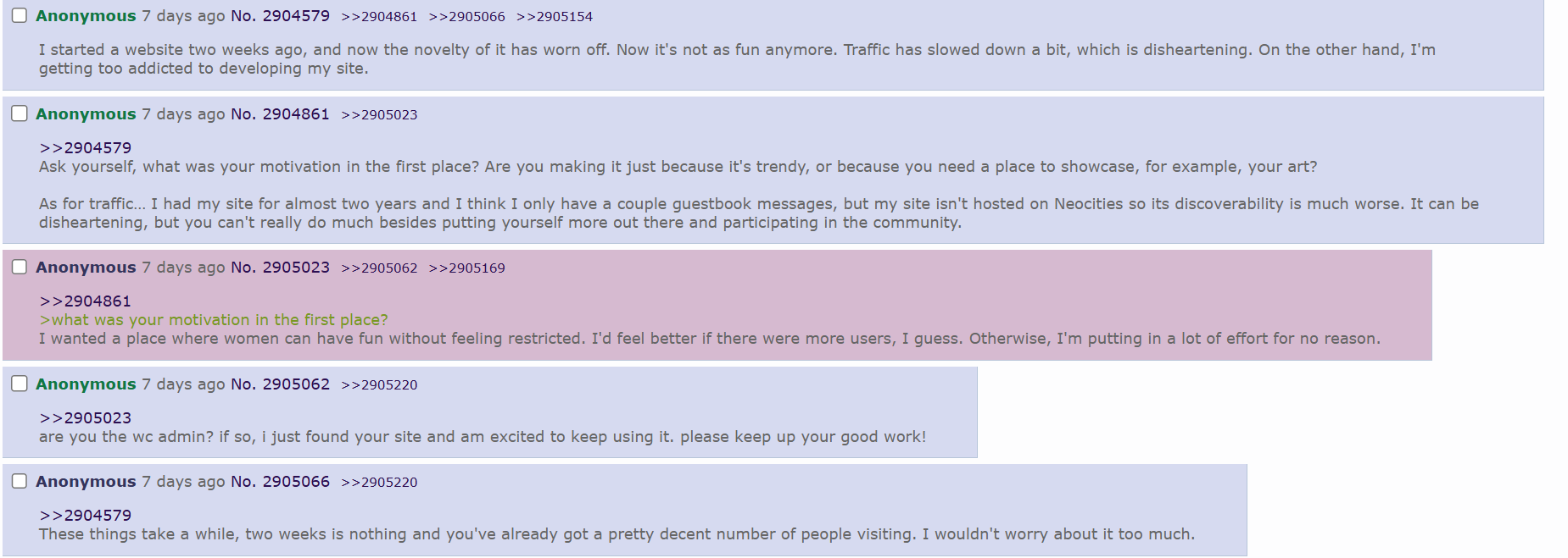 but I think I don't have the right temperament or maybe I'm just too sensitif for imageboards, because when I post something I think is clever owo or cute or really personal and it just sinks like a stone, it hurts my feelibgs and I feel worse than if I hadn't posted at all