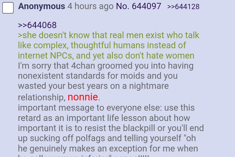>teehee I'm a pickme NLOG I'm gonna talk down to a traumatized woman and tell her men are complex beautiful humans because I've sucked off lots of scrotes in my life and to know their le complex emotions