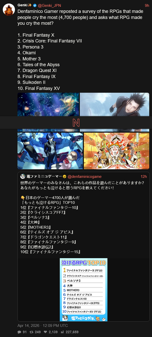 Denfaminico Gamer reposted a survey of the RPGs that made people cry the most (4,700 people) and asks what RPG made you cry the most?